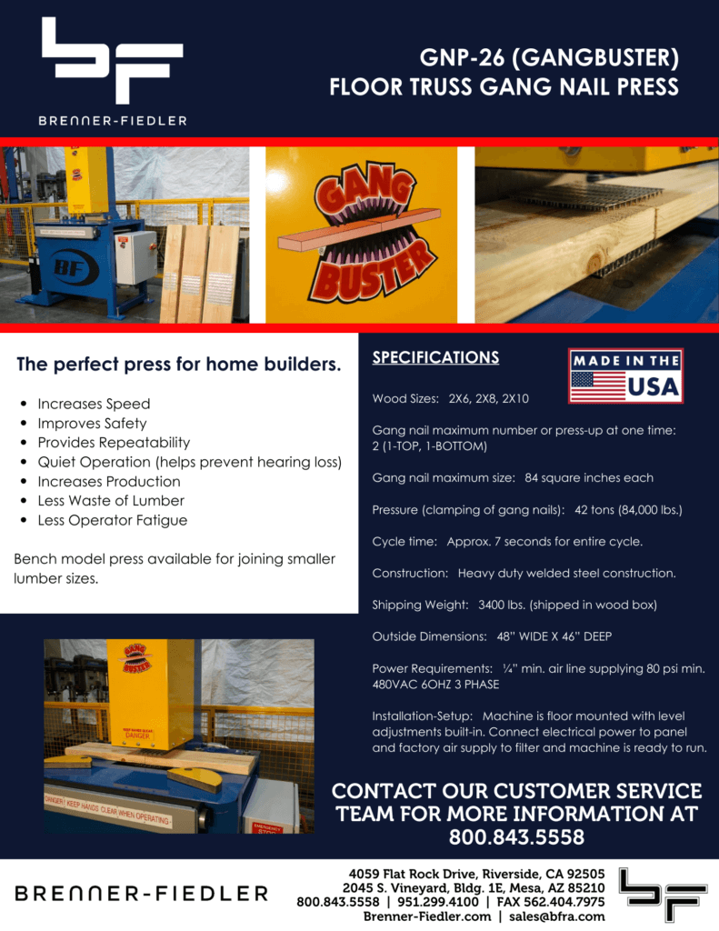 Press gang nails with ease using our gang buster. Learn more by reading the flyer.